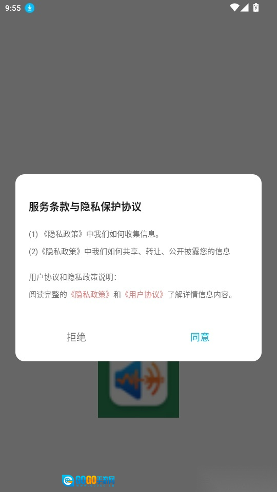 打开软件后阅读“服务条款与隐私保护协议”,点击“同意”按钮即可进入。