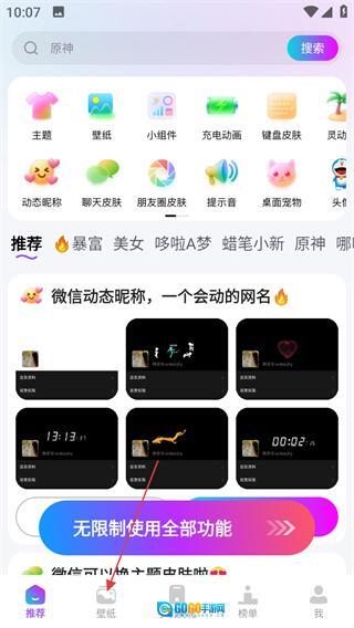 1、打开软件推荐页面,点击底部的壁纸选项,即可进入壁纸页面。