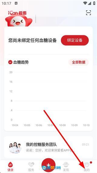 1、打开爱看健康APP,进入主界面后,点击底部导航栏中的“我的”选项,即可进入个人中心页面。