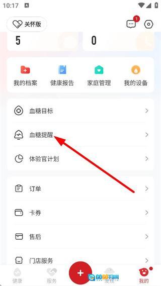 2、进入个人页面后,找到并点击“血糖提醒”选项,即可进入血糖提醒的设置界面。