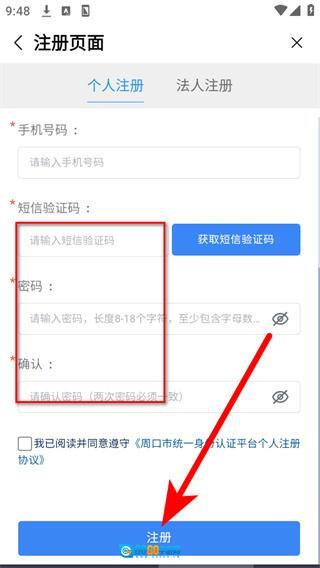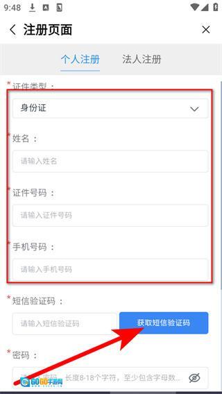 在个人注册页面填写必填信息后,点击按钮以获取短信验证码。