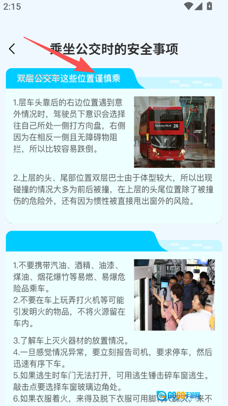 进入公交百科板块,可选择查看乘坐公交的安全事项等相关内容。