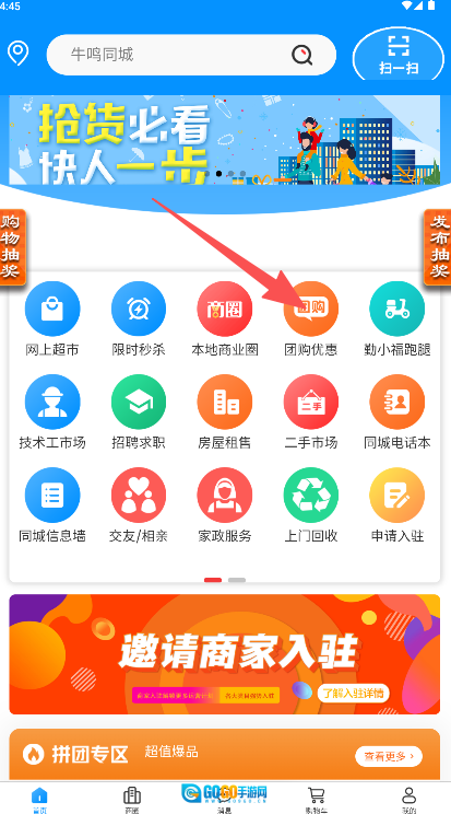 在首页的功能图标区域,点击“团购优惠”即可进入拼团页面。