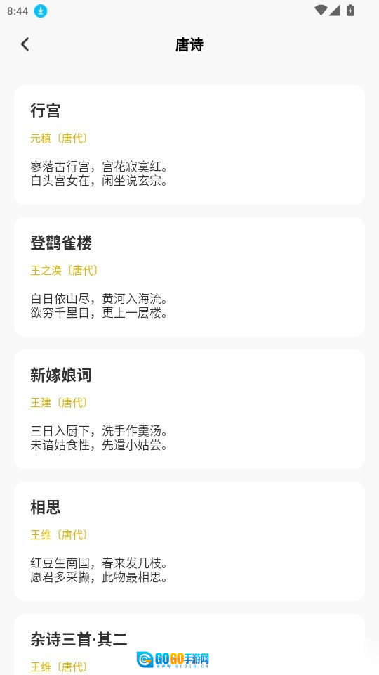 进入唐诗详情页面后,就能浏览到所有唐代诗词,你可以挑选感兴趣的诗词点击查看。