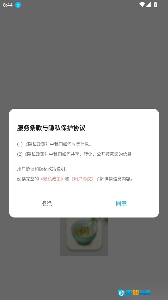 打开软件,阅读“服务条款和隐私保护协议”后点击“同意”按钮进入。