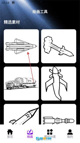 在绘画工具页面,挑选精选素材中的素材,进入绘画编辑页面。