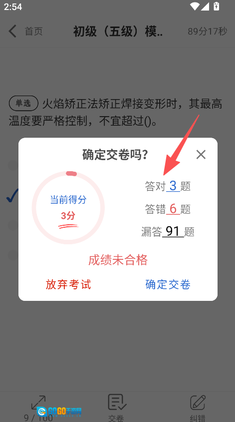 完成答题并提交试卷后,可查看当前得分,以及答对、答错和漏答的题目数量等成绩统计信息。