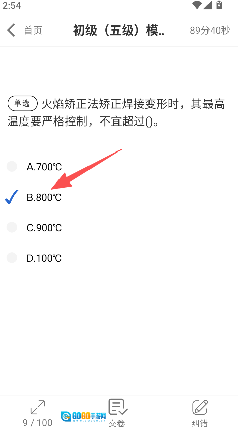 进入考试界面后,完成单选题(例如火焰矫正温度相关题目)的作答并选定答案。