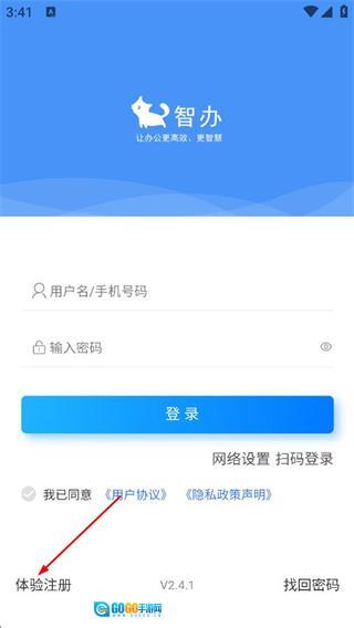 在智办的登录页面,选择体验注册选项,即可进入注册界面。