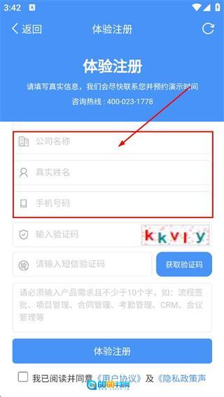 在注册体验页面,请按顺序填写公司名称、真实姓名以及手机号码对应的信息。