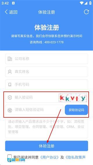 填写图形对应的验证码,点击获取验证码后,填写短信验证码,点击体验注册完成注册。