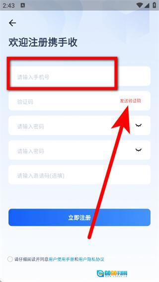 在注册页面,输入手机号,点击获取验证码。