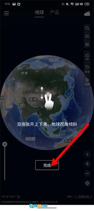 学习双指张开上下滑动,待地球视角倾斜后,点击完成,即可结束新手引导并开启探索。