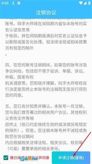 在注销协议页面,点击“申请注销”与“谨慎”按钮,即可提交账号注销申请。