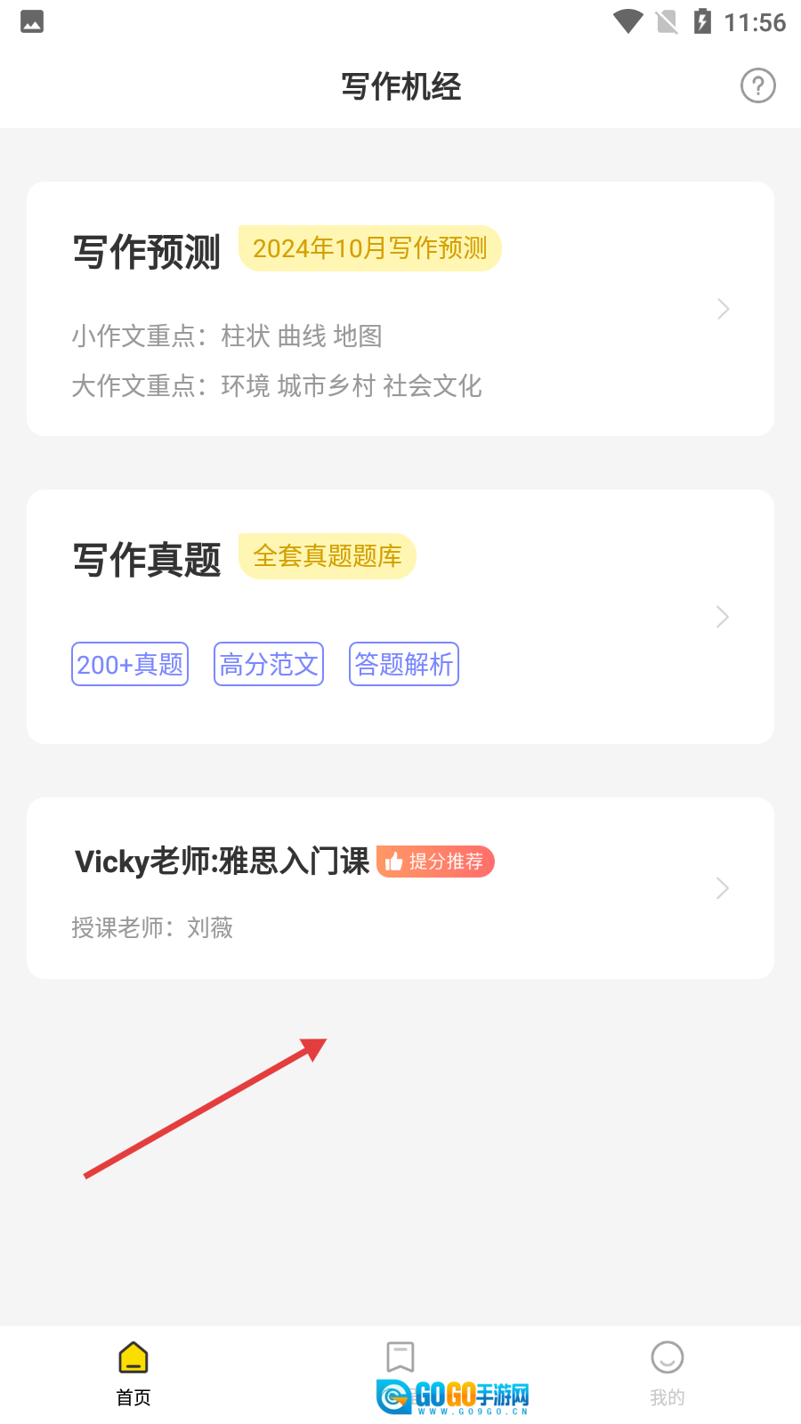 登录后进入首页,你可以查看写作预测、写作真题以及相关课程,比如Vicky老师的雅思入门课。