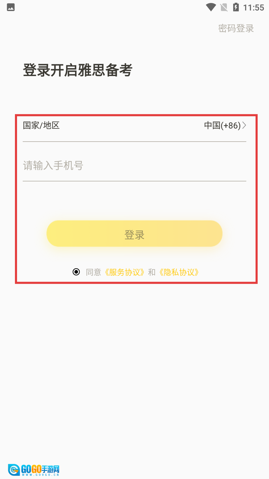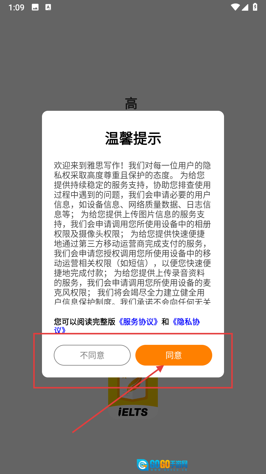 打开雅思写作应用,在显示温馨提示的页面点击【同意】按钮,即可进入登录界面。