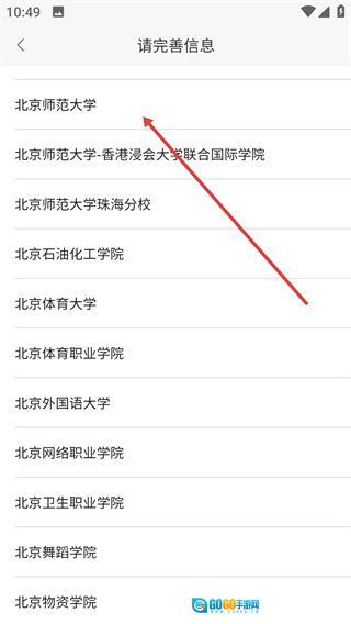 在学校选择页面选定目标院校,例如【北京师范大学】。