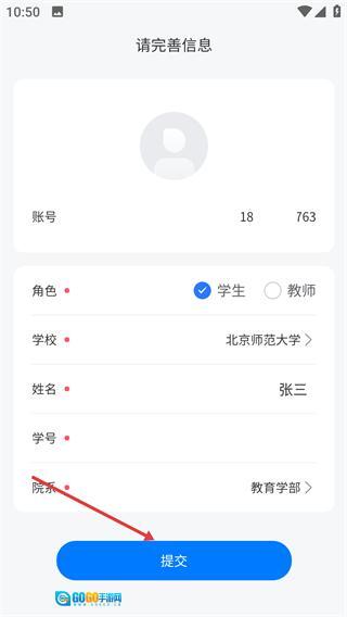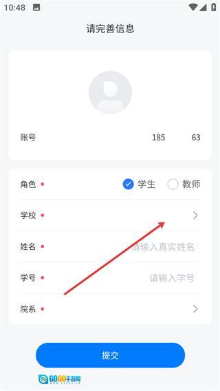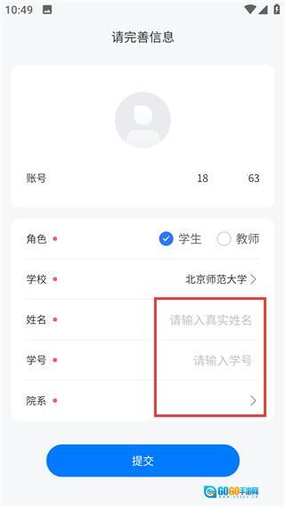 回到信息完善页面,填写【姓名】【学号】并选择对应的【院系】。
