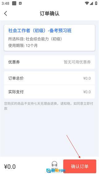 在订单确认页面仔细核对课程相关信息无误后,点击页面上的【确认订单】按钮,即可完成课程的下单流程。