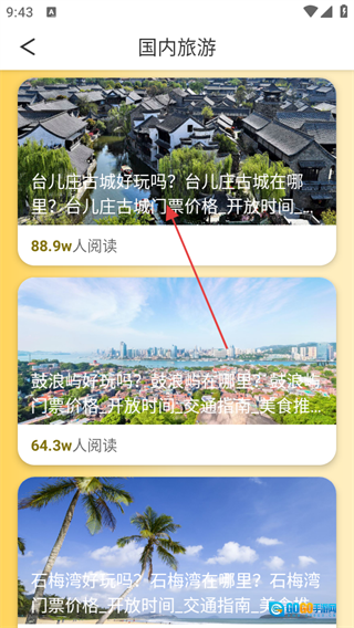 在国内旅游的内容列表页面,挑选你想了解的景点攻略,点击进入该景点的详情页面。