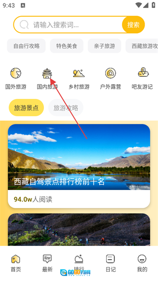 在应用首页找到【国内旅游】的功能图标并点击,即可进入国内旅游的内容列表页面。