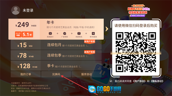 在会员购买页面,您可以点击【兑换码】按钮,通过输入兑换码来兑换相应的会员权益。