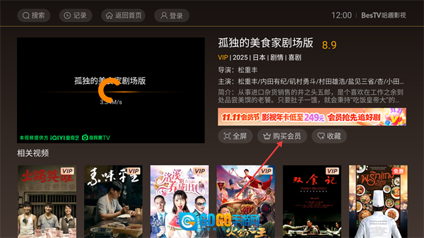 观看《孤独的美食家剧场版》时,若想观看该内容,可点击【购买会员】按钮开通会员后进行观看。
