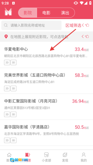 在选定城市之后,进入【影院】页面,查看【华夏电影中心】【完美世界影城】等影院的相关信息,随后点击目标影院的名称。