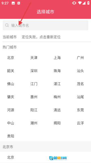 打开应用后进入【选择城市】界面,你可以点击搜索框并【输入城市名称】来查找,也能直接在【热门城市】列表里挑选想要的城市。