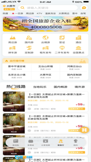 来旅行平台,为用户提供完善的本地跟团游产品和丰富的团购品类,支持在线报团旅游。
