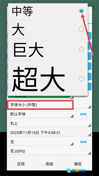 点击【字体大小】选项,挑选【中等】这类尺寸,设置好之后,就可以拍摄带有个性化时间水印的照片了。