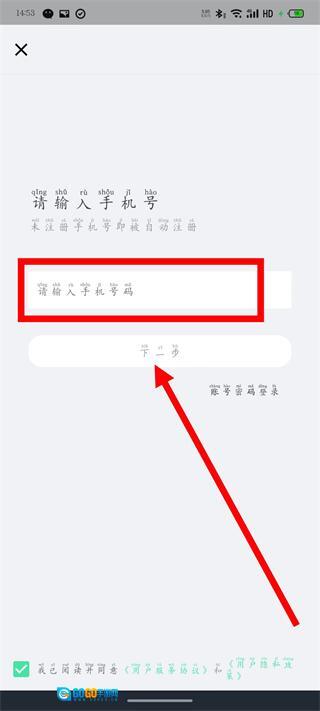 在注册页面,输入手机号,点击下一步。
