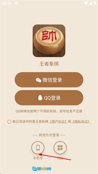 打开王者象棋应用,先勾选相关协议,再点击手机号选项,即可进入手机号登录界面。