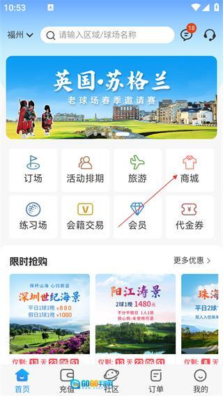 在软件首页找到【商城】功能入口,点击进入就能浏览各类高尔夫商品分类。