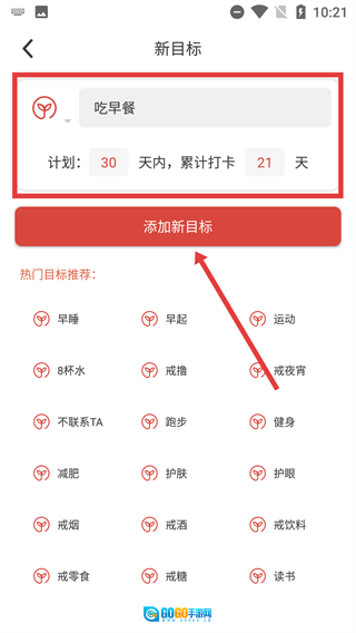 在新目标页面填写好内容,把计划设置为【30天内累计打卡21天】后,点击【添加新目标】按钮。