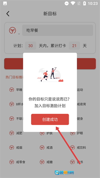 完成目标添加操作后,点击弹窗里的【创建成功】按钮,就能确认目标已创建并进入激励计划。
