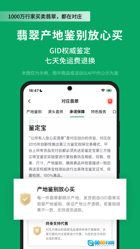 对庄翡翠作为专注于翡翠珠宝领域的专业交易与鉴定服务平台,致力于为广大翡翠爱好者打造安全可靠的交易环境。平台建立了严格的多重鉴定机制,不仅拥有上百名专业鉴定师进行实物逐一查验,还联合GID翡翠实验室出具国家认可的权威鉴定证书。同时,平台构建了全面的售后保障体系,涵盖7天无理由退换、终身免费复检等贴心权益,并郑重承诺假一赔一百万,凭借专业的服务与可靠的保障,成为了超1000万用户信赖的翡翠交易平台。