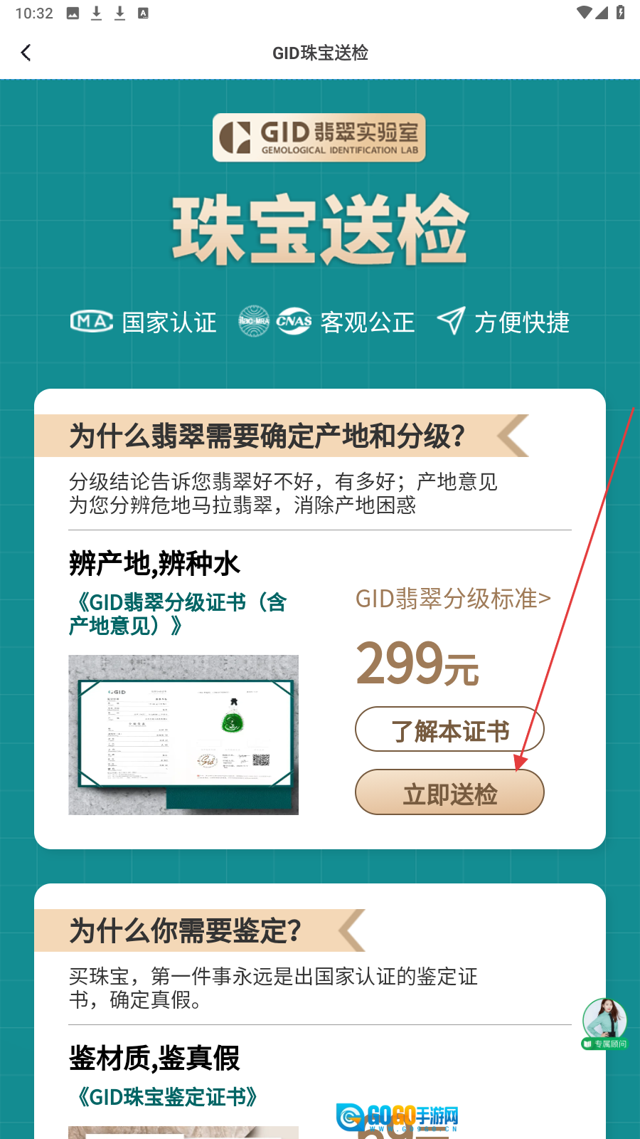 点击【权威鉴定】按钮,即可进入珠宝鉴定相关服务页面。