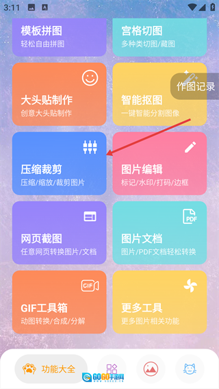 在“功能大全”页面,点击“压缩裁剪”选项。