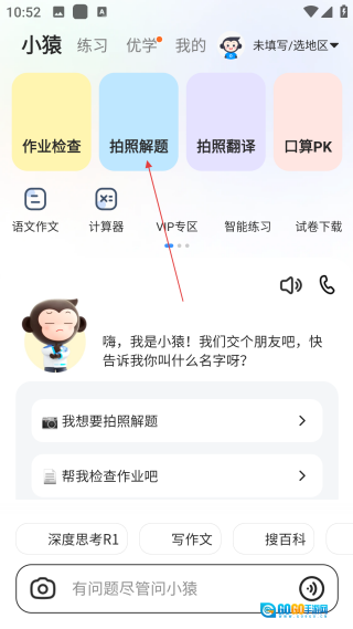 在小猿的主界面上,点击【拍照解题】按钮,即可进入题目拍摄的操作页面。