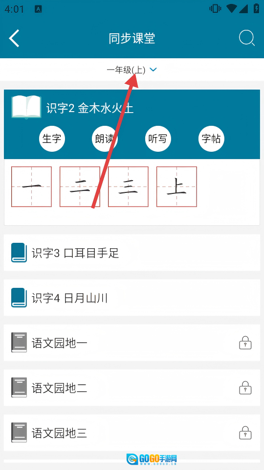 在同步课堂页面,点击年级选择下拉框,展开年级列表。