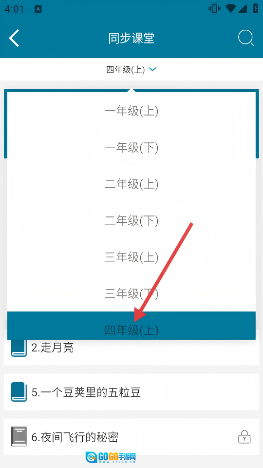 在年级列表里,找到并选择【四年级(上)】这一选项,即可进入四年级(上)的同步课堂页面。