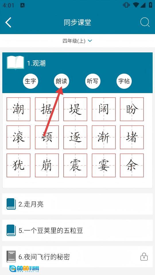 在四年级上册同步课堂页面里,找到课文《观潮》,点击它下方的【朗读】按钮,就能收听到这篇课文的朗读音频了。