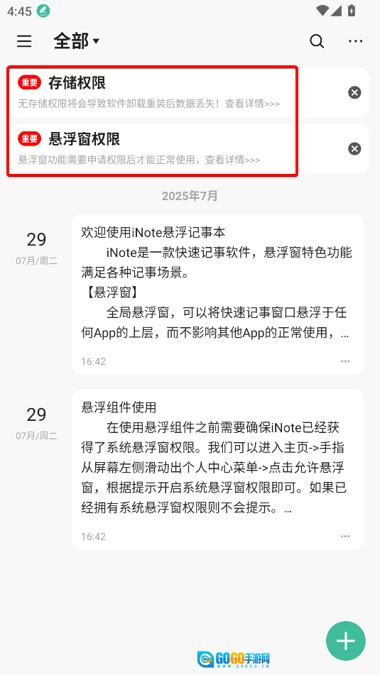 打开iNote悬浮记事本应用后,点击界面上方显示的两条提示信息,完成所需的权限配置操作。