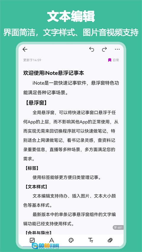 iNote悬浮记事本是一款高效的记录工具,借助全局悬浮窗的设计,能让用户在不同场景下快速完成记录。这款应用体积小巧,对系统资源的占用较低,点击悬浮球即可极速弹出,还能一键将文本粘贴到输入框中。它支持字数统计、多行输入等实用特性,用户可以自定义悬浮窗的透明度和文字大小,使用起来十分便捷,是日常办公与学习过程中的得力助手。
