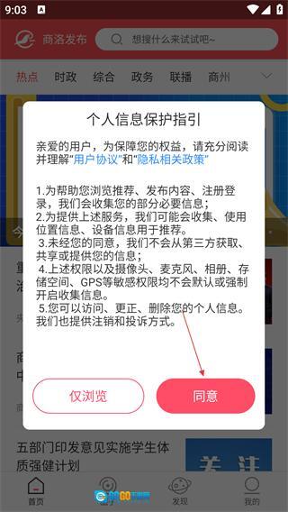 打开应用后,当弹出个人信息保护指引的弹窗时,点击【同意】按钮,即可进入应用的主界面。