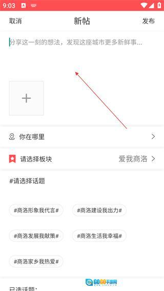 在商洛圈页面,点击右上角的相机图标,即可进入新帖发布的编辑界面。