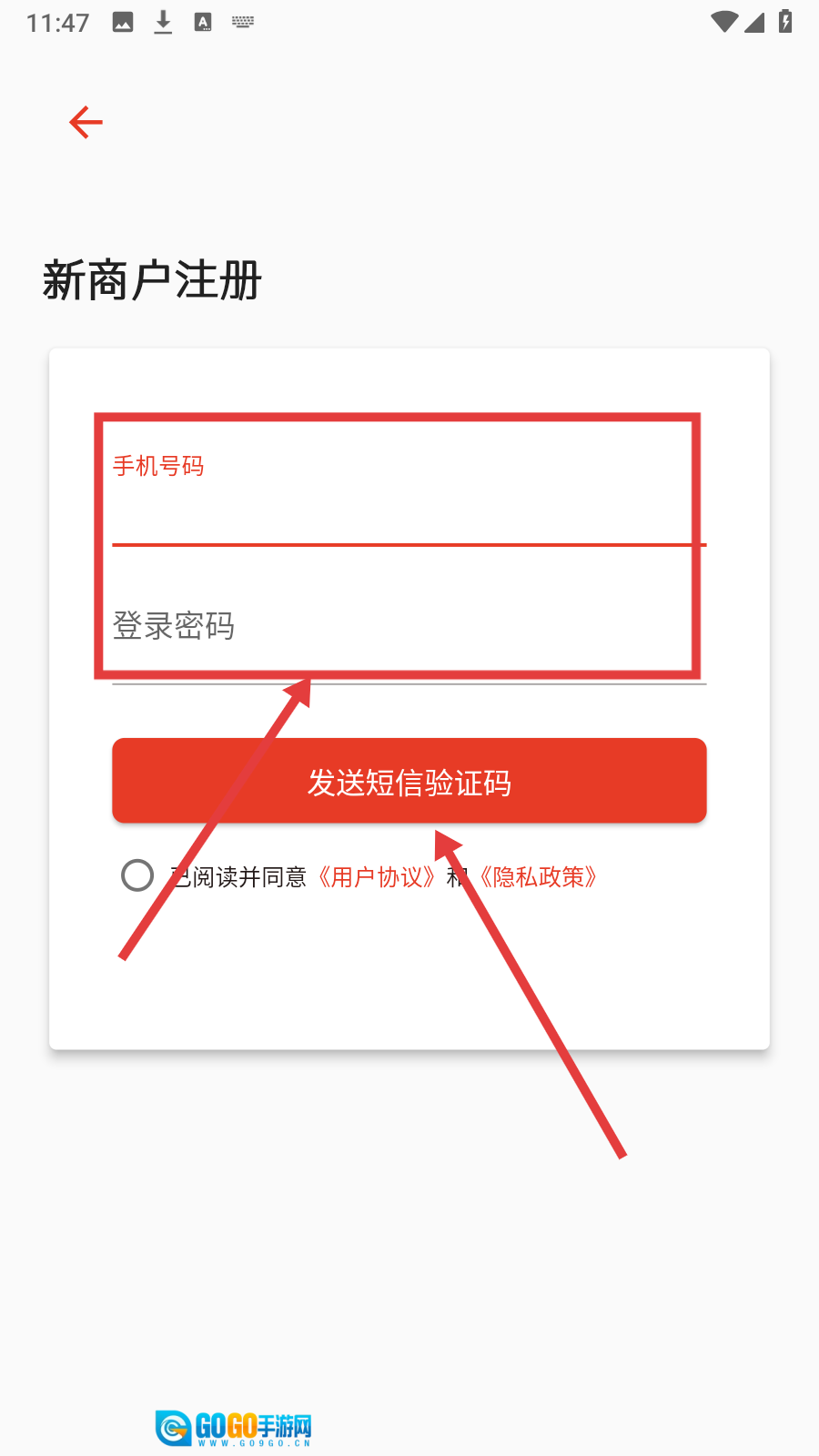在新商户注册界面填写手机号码与登录密码后,点击【发送短信验证码】按钮。