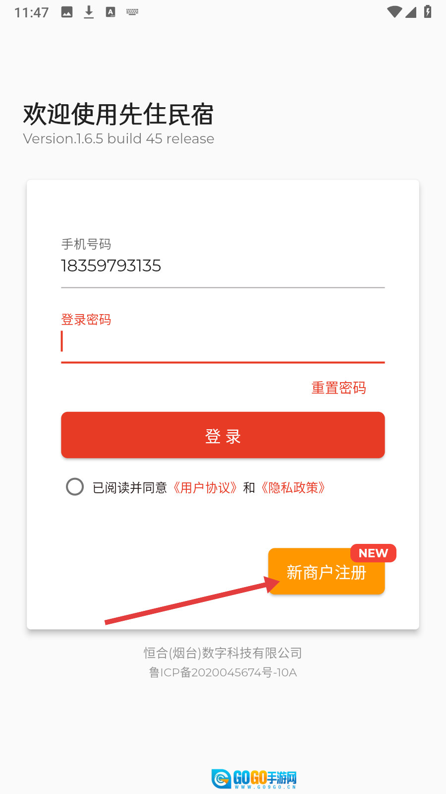 在登录页面点击【新商户注册】按钮,即可进入新商户注册页面。