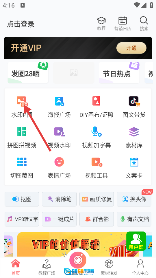 在首页找到并点击【水印P图】的功能图标,即可进入图片选择页面。